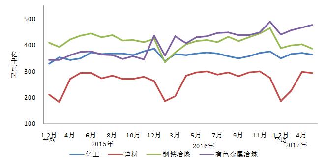 1-5月份,化学原料制品、非金属矿物制品、黑色金属冶炼和有色金属冶炼四大高载能行业用电量合计7216亿千瓦时,同比增长6.9%,增速比上年同期提高10.5个百分点;合计用电量占全社会用电量的比重为29.7%,对全社会用电量增长的贡献率为32.0%。其中,化工行业用电量1795亿千瓦时,同比增长3.3%,增速比上年同期回落1.1个百分点;建材行业用电量1191亿千瓦时,同比增长3.3%,增速比上年同期提高4.8个百分点;黑色金属冶炼行业用电量1952亿千瓦时,同比增长4.2%,增速比上年同期提高14.4个百分点;有色金属冶炼行业2279亿千瓦时,同比增长14.5%,增速比上年同期提高19.5个百分点。